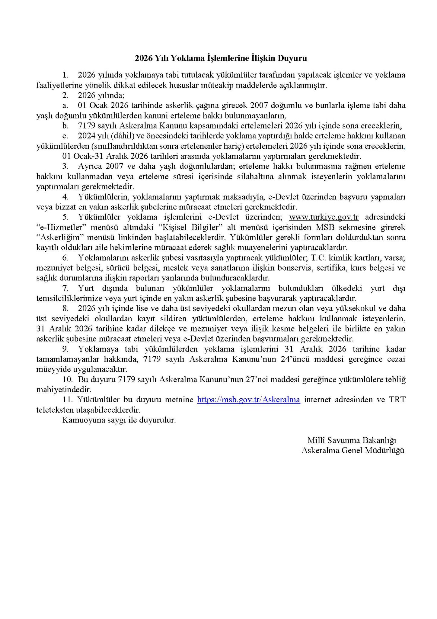 Milli Savunma Bakanlığı'nın 2026 yılı askerlik yoklama işlemlerine ilişkin duyurusu aşağıda sunulmaktadır.